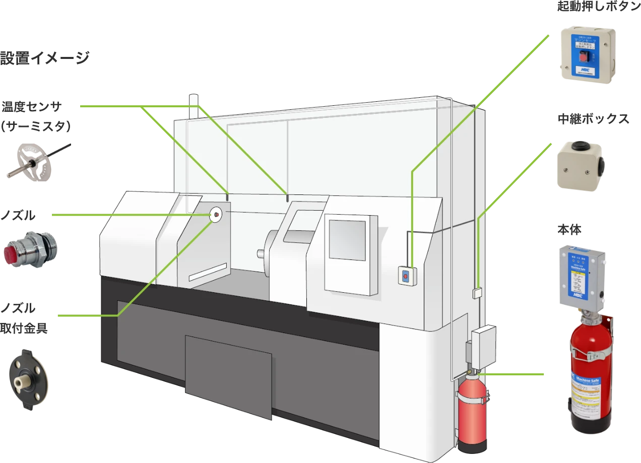 取り付けられた放射ノズルから消火薬剤を自動で放出。